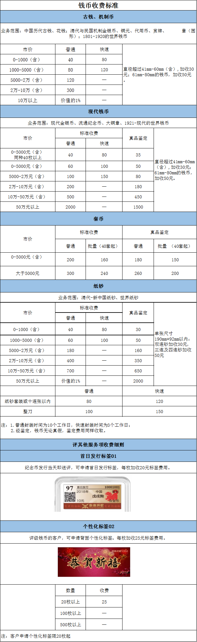 钱币标准收费